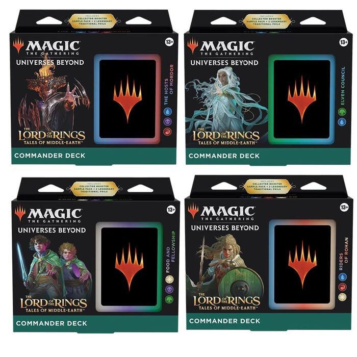 Caja de cartón con 4 barajas con 1 carta Commander, 98 normales, 2 foil. 10 tokens a doble cara y un sobre de coleccionista muestra.